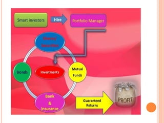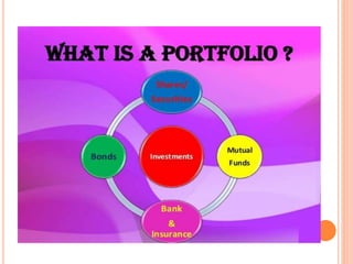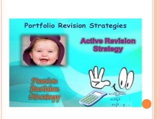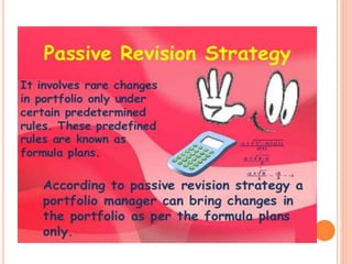 A portfolio is a combination of various investment products like bonds, shares, securities, and mutual funds. Portfolio revision involves changing the mix of securities in an existing portfolio by adding or removing assets. This is done to maximize returns and minimize risks. Reasons for portfolio revision include having additional funds to invest, changes in financial goals, or market fluctuations. There are active and passive portfolio revision strategies, with active strategies involving more frequent changes and passive only changing according to predetermined rules. The roles of a portfolio manager include designing customized investment plans, keeping up to date on the market, guiding clients impartially, and regularly communicating with clients.