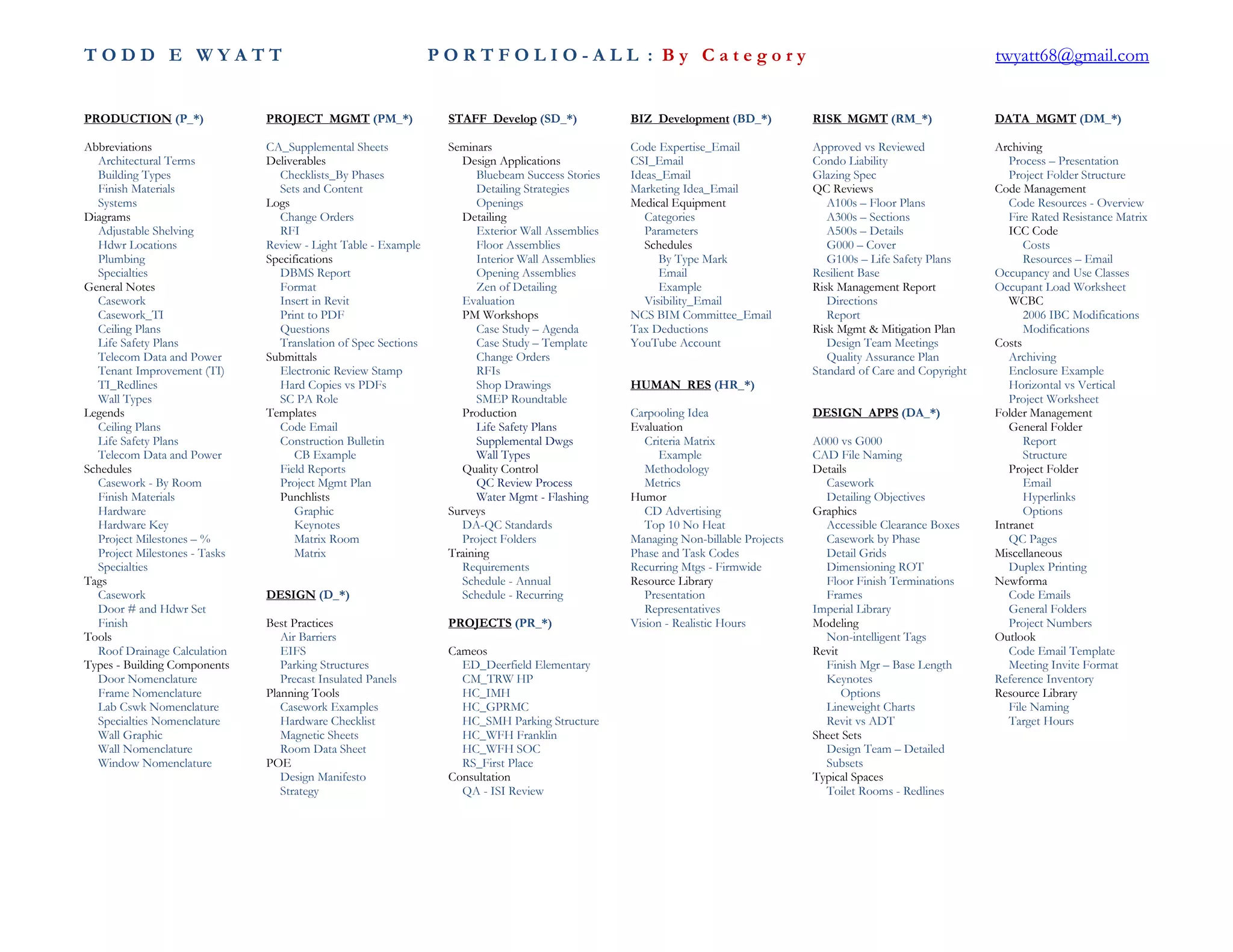 This document provides a categorized portfolio of project documents and resources for Todd Wyatt. The categories include Production, Project Management, Staff Development, Business Development, Risk Management, and Data Management. Under each category are listed specific document types, templates, checklists, diagrams, schedules, and other resources related to architectural project delivery and management.