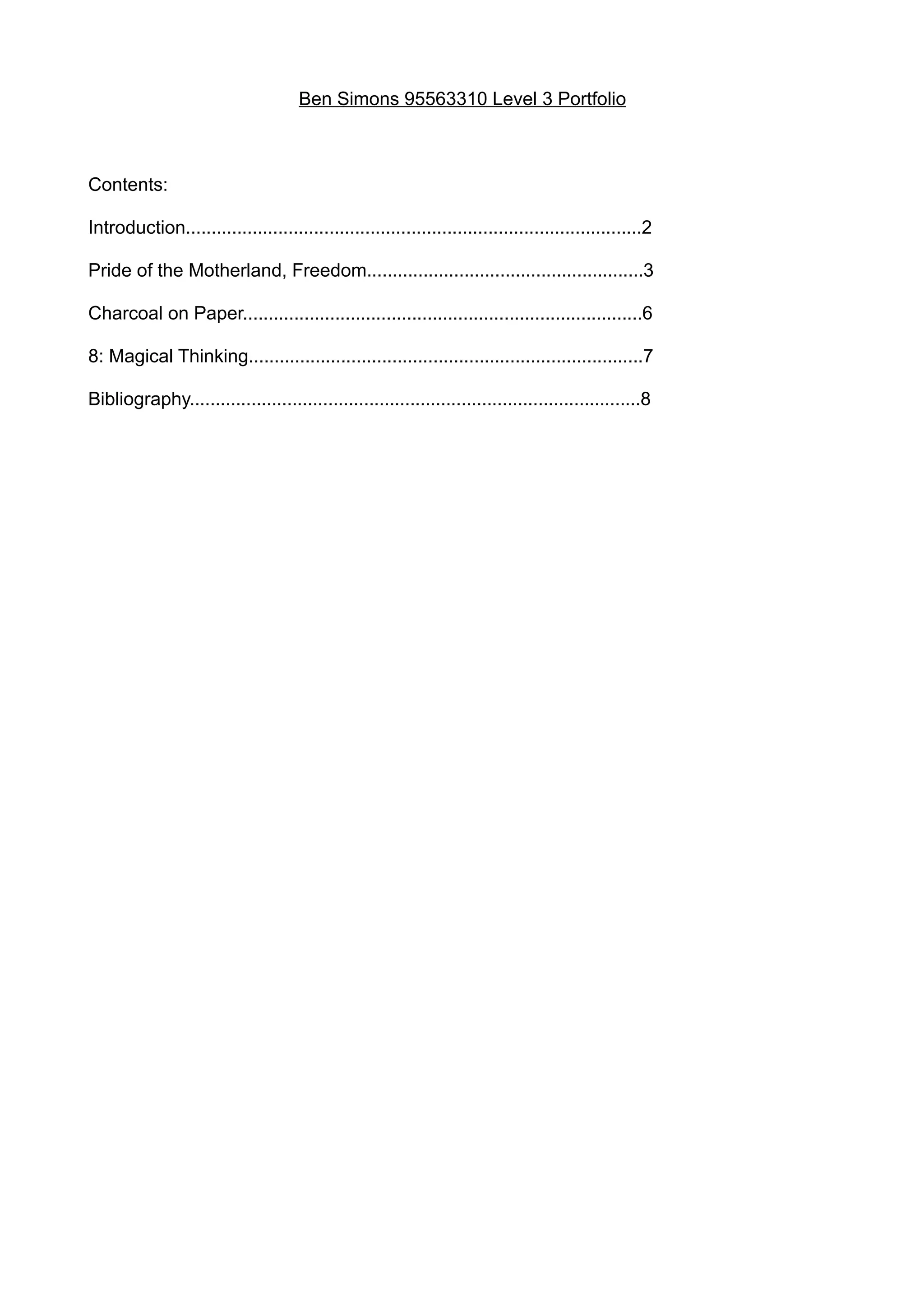 Ben Simons submitted a level 3 portfolio containing 4 projects with sound design elements. For the "Pride of the Motherland, Freedom" theatrical performance, he created chain and thunder sounds using layered bike chain recordings and Logic's thunder loops combined with rain. For the "Charcoal on Paper" animation, he sourced and implemented birdsong and other sound effects. As the voiceover editor for "8: Magical Thinking", he recorded voiceovers using a Zoom H4N after the studio equipment failed and edited them in Pro Tools. The portfolio demonstrates his sound recording and editing skills across different projects.