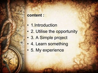 The author, Dhili Kumar, is a mechanical engineering student who provides an overview of his educational and technical skills. He has experience with projects including designing and fabricating a chair, creating designs in Solidworks, and utilizing an opportunity for an internship. The portfolio highlights several of Dhili's design projects and the lessons he learned around time management, quality, and overcoming mistakes.