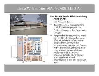 Linda W. Bernauer is an architect with experience managing public safety, justice, transportation, and commercial projects. She has served as project manager for projects such as a 42,000 square foot public safety answering point in San Antonio and a 99,000 square foot youth village in Dallas. Bernauer is responsible for all financial aspects of projects, client coordination, and organizing design teams. She has completed projects across several states and sectors totaling over $1 billion in construction costs.