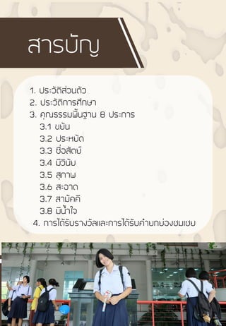 คุณธรรมพื้นฐาน 8 ประการ 3.1 ขยัน 3.2 ประหยัด 3.3 ซื่อสัตย์ 3.4 มีวินัย 3.5 สุภาพ 3.6 สะอาด 3.7 สามัคคี 3.8 มีน้้าใจ 4. การได้รับรางวัลและการได้รับค้ายกย่องชมเชย สารบัญ