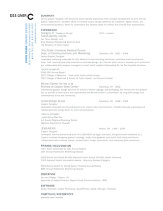The document is a detailed resume for a senior graphic designer with extensive experience in brand identity, marketing materials, and graphic applications. The designer has worked with various clients, including Ohio State University Medical Center, and has received multiple awards for their work. They possess strong skills in Adobe software and have a portfolio that includes both freelance projects and collaborative efforts in design and marketing.