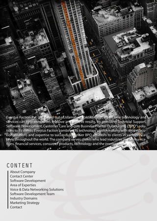 EventusFaction is a technology company based in Islamabad, Pakistan that provides technical support, software development, customer care, and business process outsourcing solutions to clients. It combines its technology platform with solid execution solutions and expertise to successfully deliver outsourcing solutions to clients around the world in industries like communications, financial services, consumer products, and energy. The company has development and contact centers in Islamabad that provide services like software development, customer support, and networking solutions.