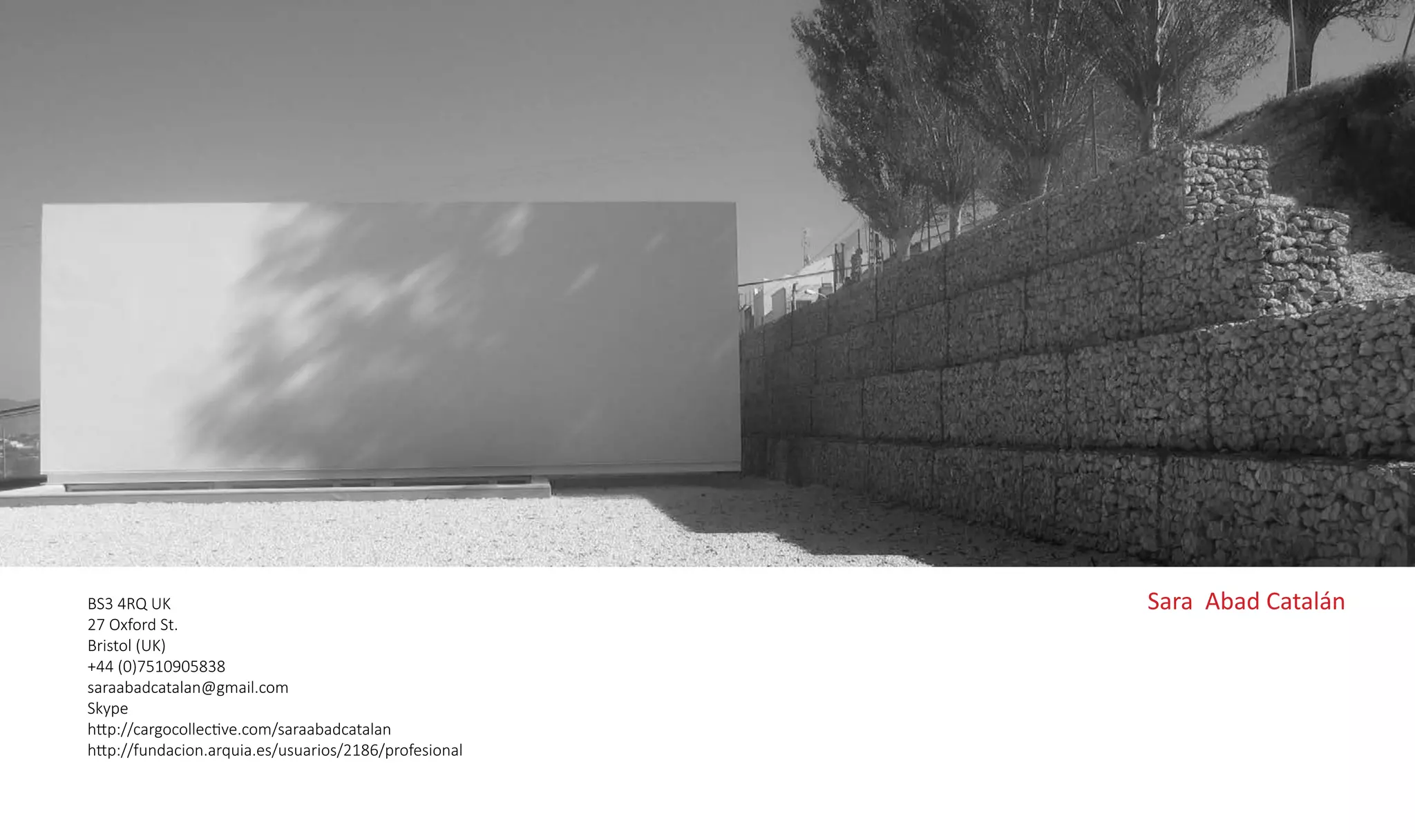 This document provides biographical and portfolio information for Sara Abad Catalán, an architect and artist based in the UK and Spain. It summarizes her educational background, areas of research focus, and past professional experience leading architectural projects. Examples of her artistic works incorporating concepts of emotion, landscape, and phenomenology are also described, including site-specific installations, photographs, and a video installation.