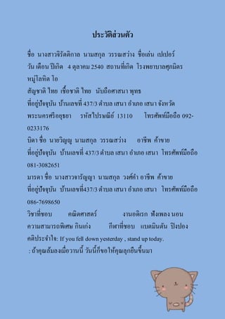 ชื่อ นางสาวจิรัตติกาล นามสกุล วรรณสว่าง ชื่อเล่น เปเปอร์