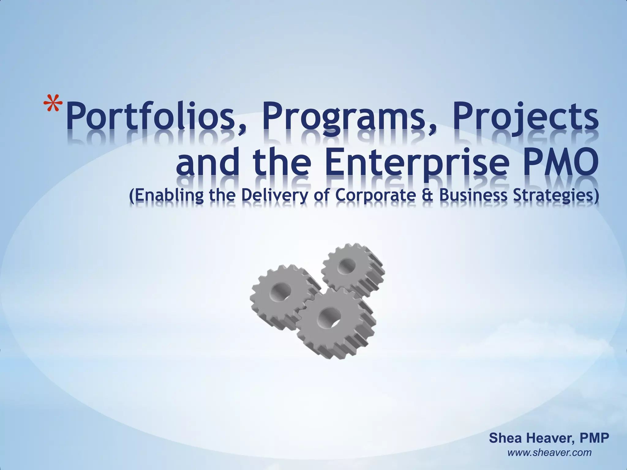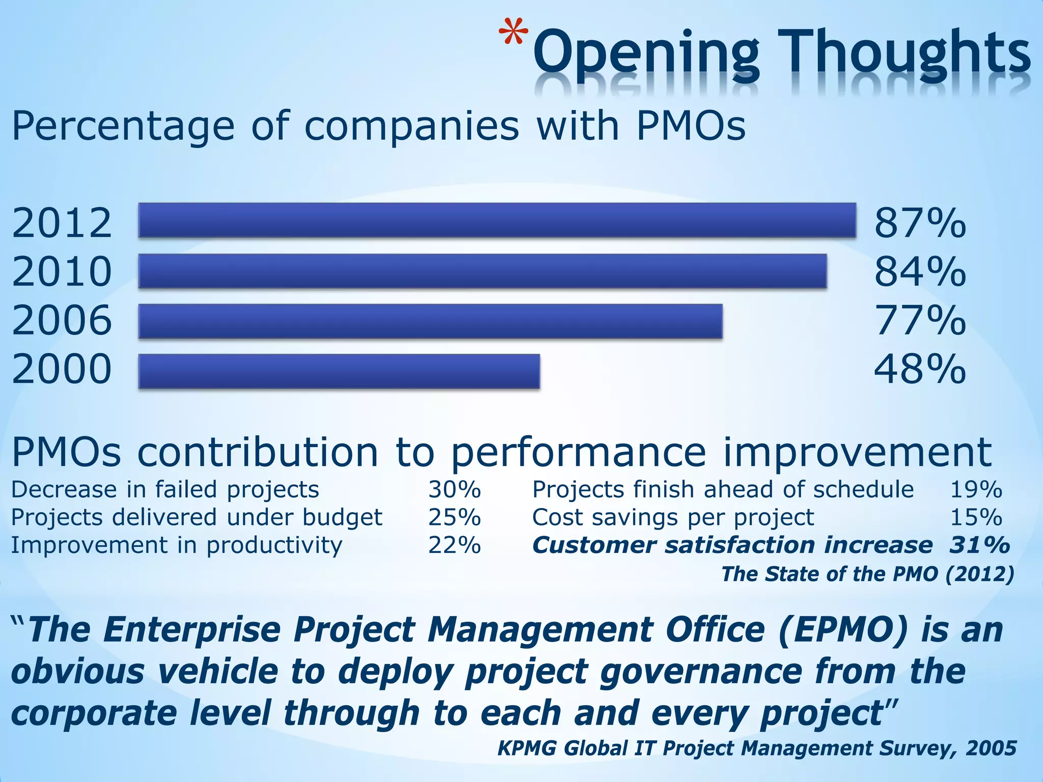 The document discusses the role of Project Management Offices (PMOs) in enabling the delivery of corporate and business strategies. It notes that PMOs have been shown to decrease failed projects by 30% and increase projects delivered under budget by 25%. The document then outlines how PMOs can support business alignment, project portfolio management, project governance, and more. It describes how corporate strategy drives business strategies, and how business strategies are implemented through programs, projects, and products. Finally, it argues that a PMO is needed to integrate business and technical strategies, apply standard practices and metrics across all projects, and provide a unified view of strategic endeavors through portfolio, program and project monitoring.