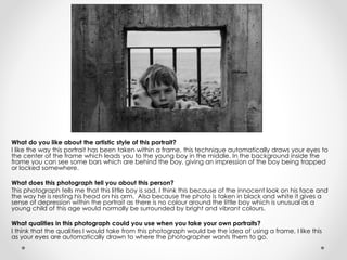 Key qualities mentioned for the photographer's own work include framing the subject, contrasting dark and light tones, and including multiple subjects.