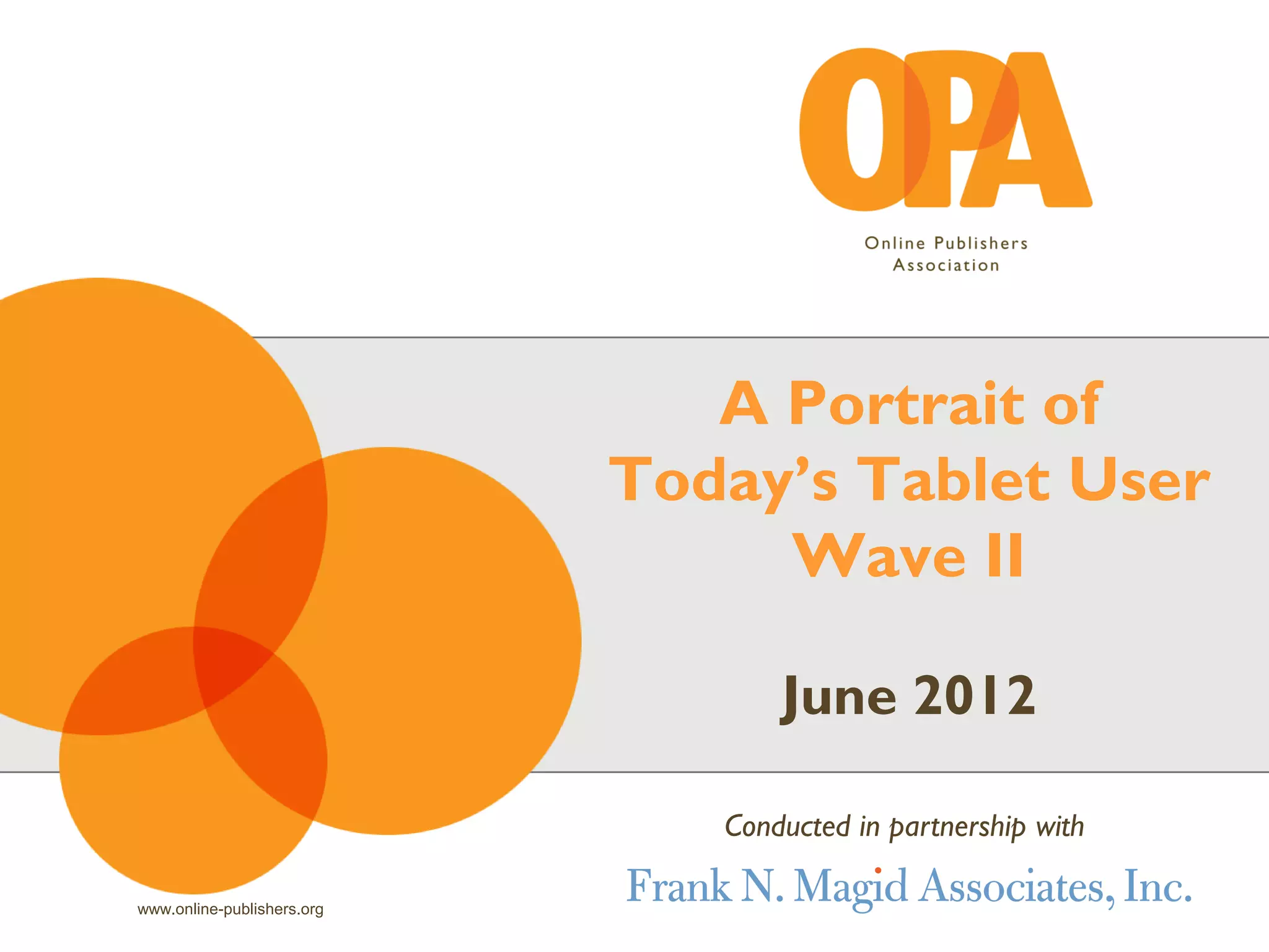 The document summarizes findings from a study on tablet users conducted in June 2012 by Frank N. Magid Associates. Some key findings: