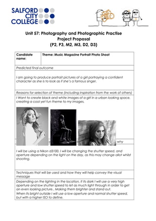 The document is a project proposal for a portrait photography shoot with the theme of a music magazine. It will feature pictures of a girl portraying a confident singer in an urban space.