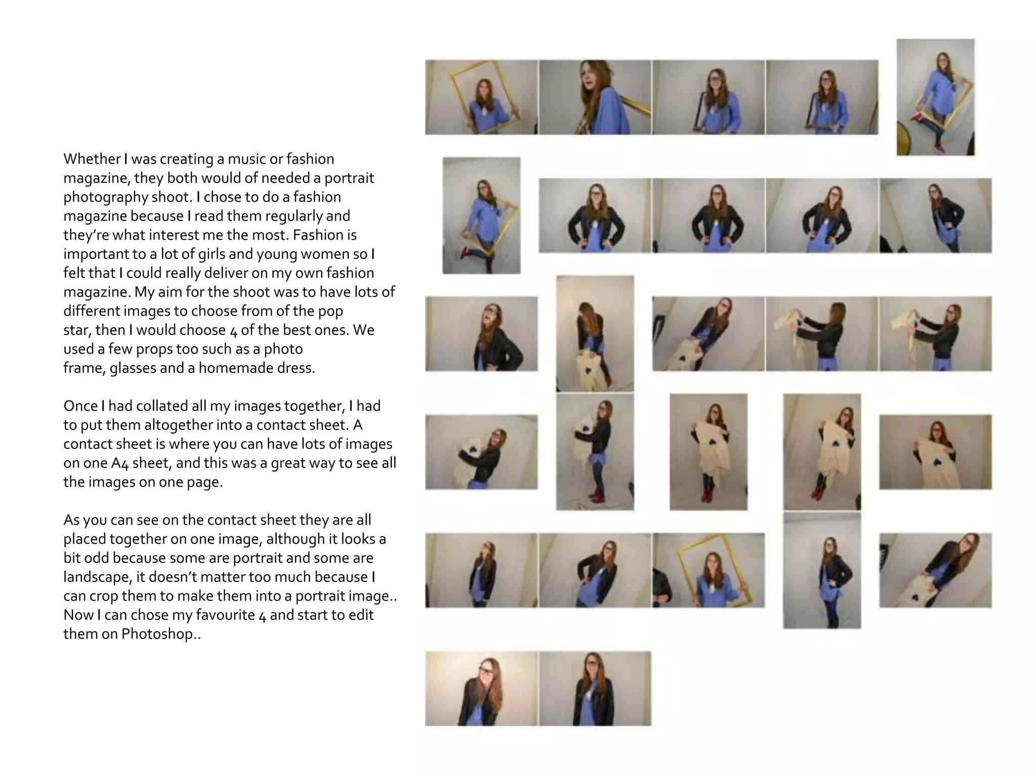 - The document describes the process of editing photos for a fashion magazine portrait shoot. It discusses selecting 4 photos, editing them on Photoshop, and preparing them for use on the magazine cover and interior pages.