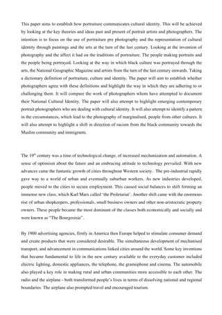 This document discusses how portraiture communicates cultural identity through history. It begins with a brief history of portraiture from paintings of wealthy individuals and royalty to the rise of photography making portraits more widely accessible. The document then explores how early photographers captured portraits that depicted cultural identity, both positively through images of black cultural heritage, and negatively through racist stereotypes. The document continues looking at the changing subjects and styles of portraits throughout the 19th and 20th centuries as new technologies emerged and social norms evolved.