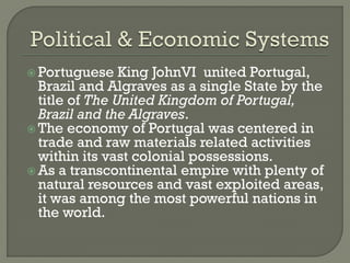 The document discusses the history of Portugal's colonial empire. Portugal united with Brazil in the early 19th century to form the United Kingdom of Portugal, Brazil and the Algarves. As a transcontinental empire with colonies in Brazil, Africa, and Asia, Portugal had a strong economy based on trade and natural resources. At its peak, Portugal's vast colonial possessions made it one of the most powerful nations in the world.