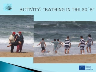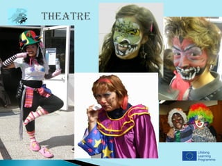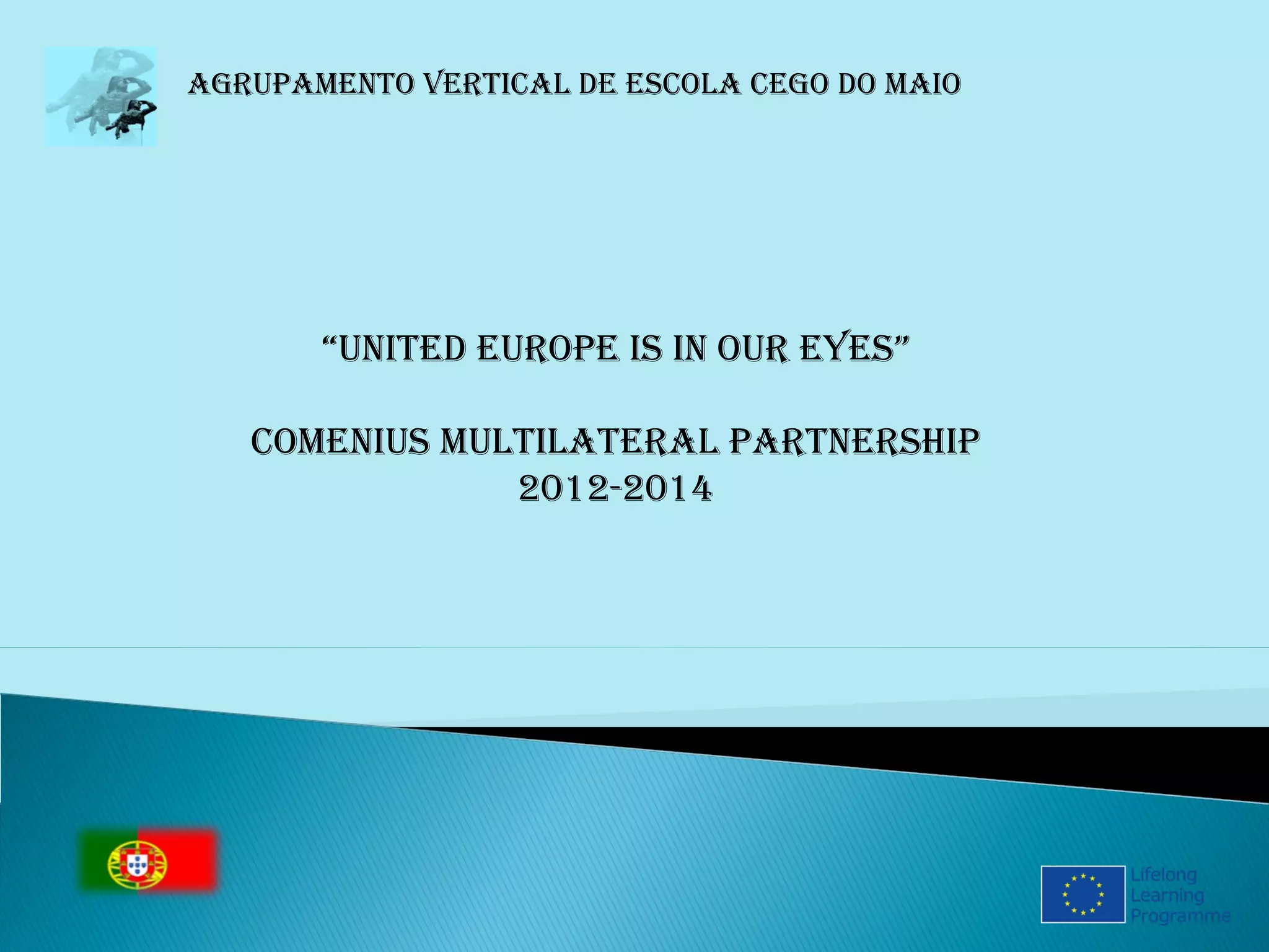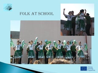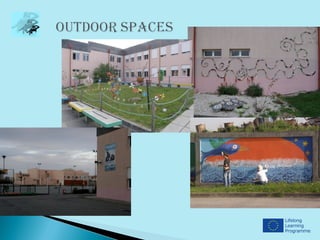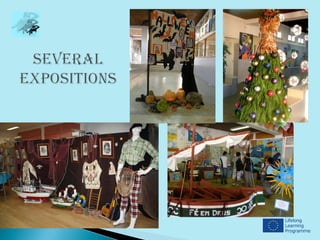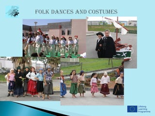 This document provides information about a school in Póvoa de Varzim, Portugal that is participating in a Comenius partnership project from 2012-2014. It includes photos of the school interior showing areas like the canteen, arts room, auditorium, and teacher's room. It also shows various student activities like ceramics, music education, physics/chemistry, athletics, rhythmic dance and students dressed in costumes. Brief introductions are provided from teachers Sofia Lima and Anabela Torre, and two student classes (6th grade A and B) sharing details about themselves.