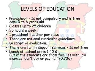 The Portuguese education system has several levels including pre-school, primary school, and secondary school. Pre-school is not compulsory and aims to educate children ages 3 to 6. Primary school is compulsory and consists of 9 years of basic education divided into 3 cycles. Secondary school lasts for 3 years and offers both academic and vocational courses. The education is publicly funded and mostly free, with subsidized costs for low-income families. Standardized testing is used for assessment.