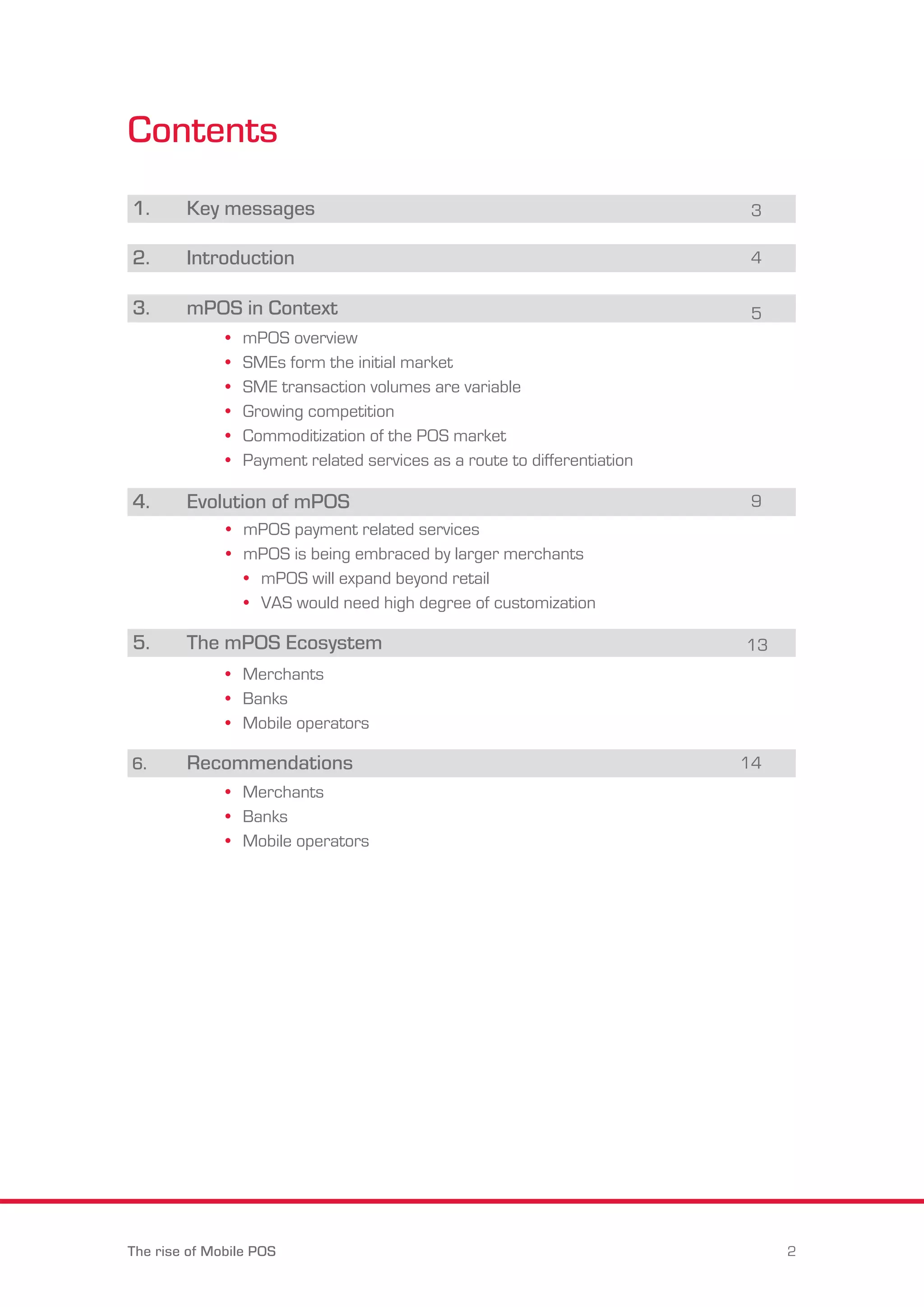 The document discusses the rise of mobile point of sale (mPOS) technology. It notes that while mPOS hardware is becoming commoditized, value-added services provide an opportunity for differentiation. It recommends that mPOS providers develop specialized applications tailored to different industries rather than a one-size-fits-all approach. The document also predicts growth of mPOS in emerging markets and convergence of merchant acceptance and consumer mobile payment ecosystems.