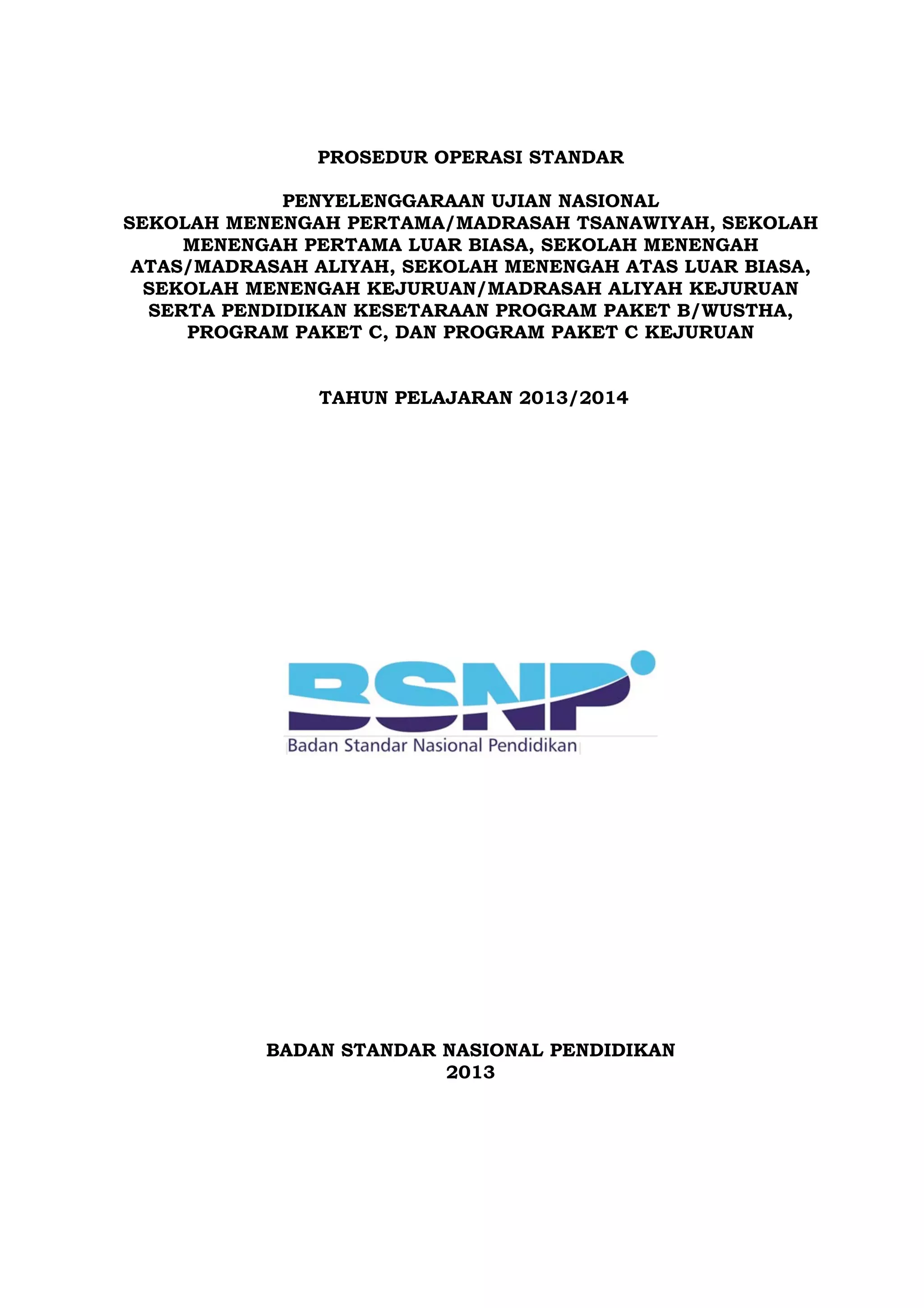 Dokumen ini menetapkan prosedur operasi standar (POS) untuk penyelenggaraan ujian nasional bagi berbagai jenjang pendidikan, termasuk SMP, SMA, dan program pendidikan kesetaraan untuk tahun pelajaran 2013/2014. BSNP bertanggung jawab dalam menyusun, mengatur, dan mengawasi pelaksanaan ujian, serta menetapkan kriteria kelulusan bagi peserta didik. Peraturan ini juga merinci tugas pelaksana ujian di tingkat pusat, provinsi, dan kabupaten/kota.