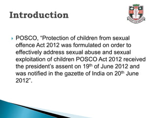 The document summarizes the Protection of Children from Sexual Offences (POSCO) Act 2012 in India. The Act defines a child as anyone under 18 years of age and provides legal protection against sexual abuse and exploitation. It introduced new offenses specific to child sexual abuse to address gaps in previous laws. The POSCO Act prescribes strict punishments including imprisonment and fines for offenses ranging from penetrative sexual assault to sexual harassment or use of children in pornography. The goal is to effectively protect children under 18 from sexual crimes through the criminal justice system.