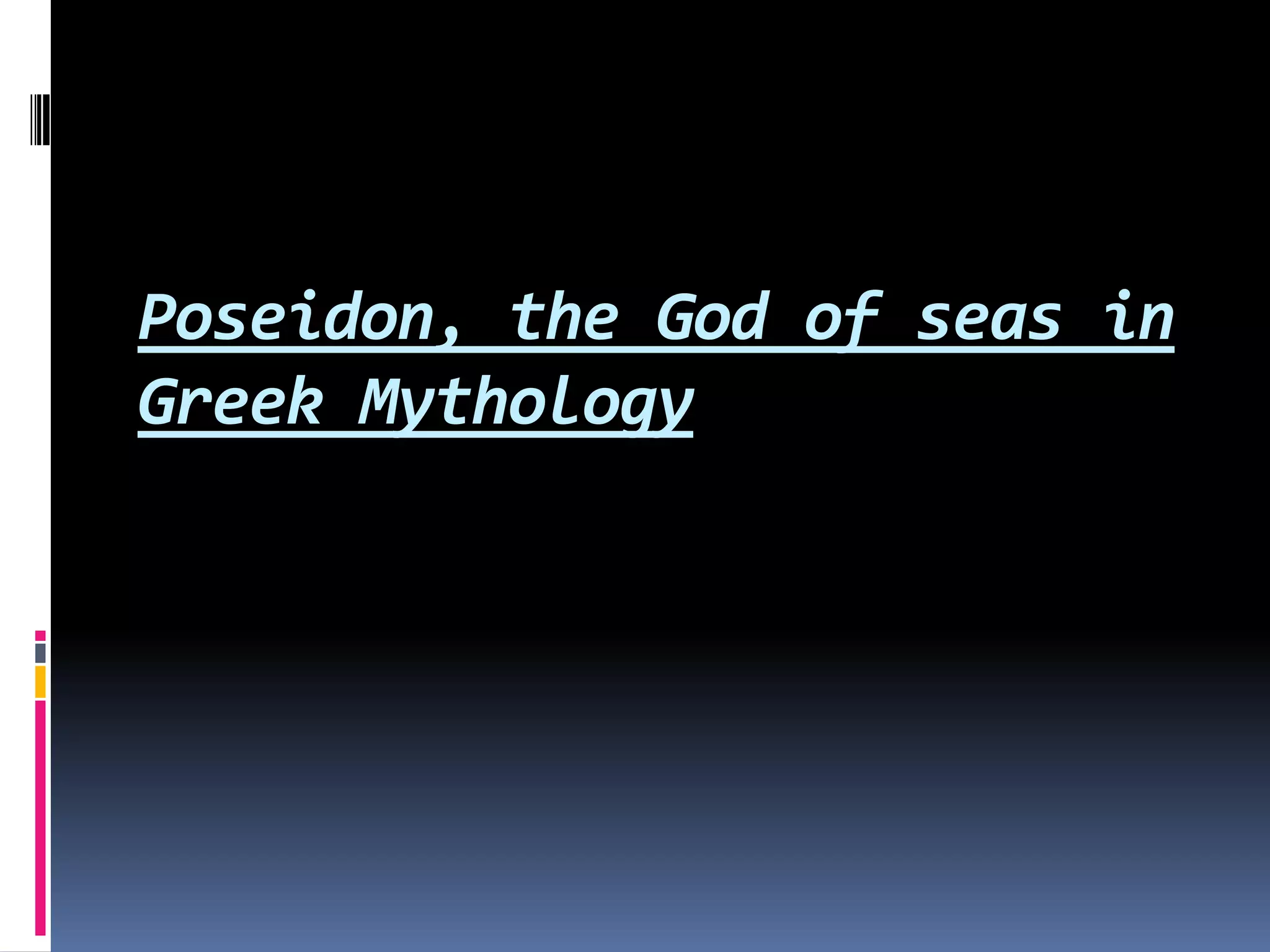 Poseidon was the Greek god of the sea and son of Cronus and Rhea. He had many children including Theseus and Triton. Before becoming the god of the sea, Poseidon was known for causing earthquakes. In a battle with Athena over which god would name the city, Poseidon struck the ground with his trident to bring forth a saltwater spring while Athena planted an olive tree. The city chose Athena's gift of the olive tree and was named Athens.