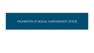 The document discusses India's Prevention of Sexual Harassment (POSH) Act from 2013. It summarizes that the Act was established to prevent and address sexual harassment complaints in the workplace, founded on guidelines from a 1997 Supreme Court case. The Act defines sexual harassment and establishes a mechanism and timeline for handling complaints through an Internal Complaints Committee, including conducting inquiries and recommending punishments.