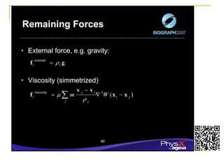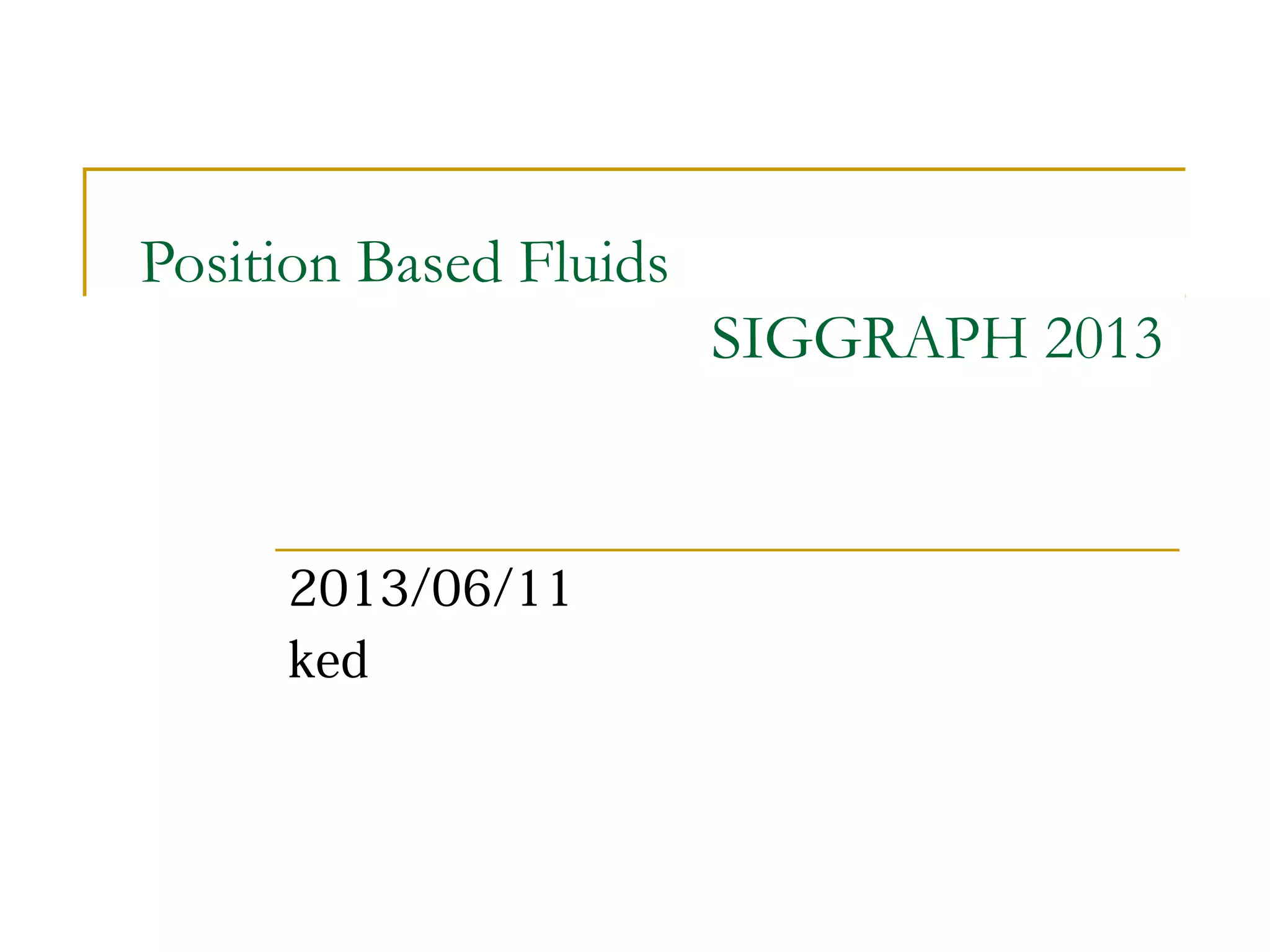 This document summarizes a technique called position based fluids. It describes how smoothed particle hydrodynamics (SPH) and position based dynamics (PBD) are used. SPH uses kernel functions to compute density from particle positions. PBD iteratively solves constraints to update positions implicitly. The technique uses a scalar density constraint based on target density. It also applies artificial pressure and vorticity confinement forces. It can simulate fluids with 128k particles at 16ms per frame using this position based approach.