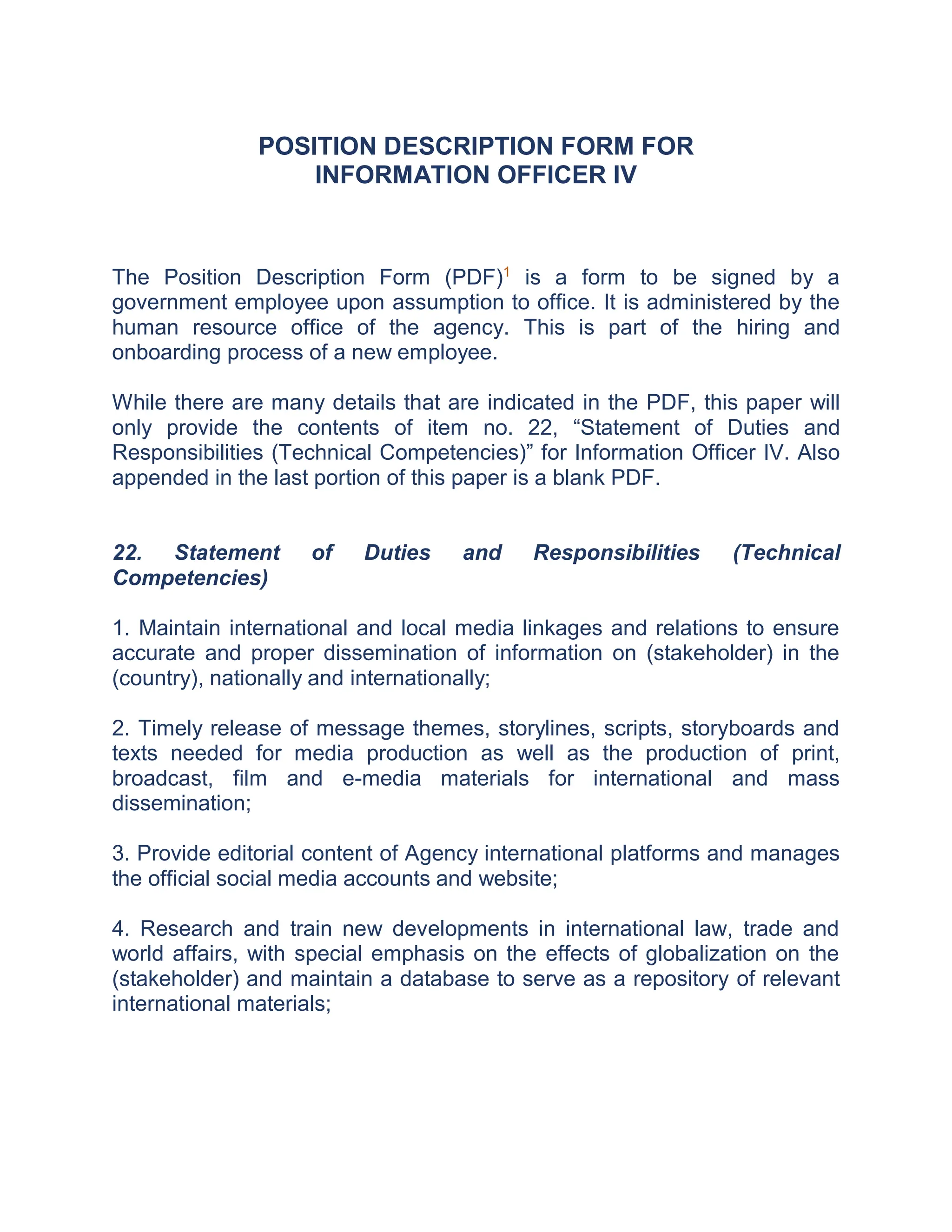 The document outlines the position description for the Information Officer IV role, detailing the responsibilities related to media relations, content management, and international law research. Key duties include maintaining media linkages, producing communication materials, managing social media, and analyzing developments in international trade and law. It serves as part of the hiring and onboarding process for new employees in the government agency.