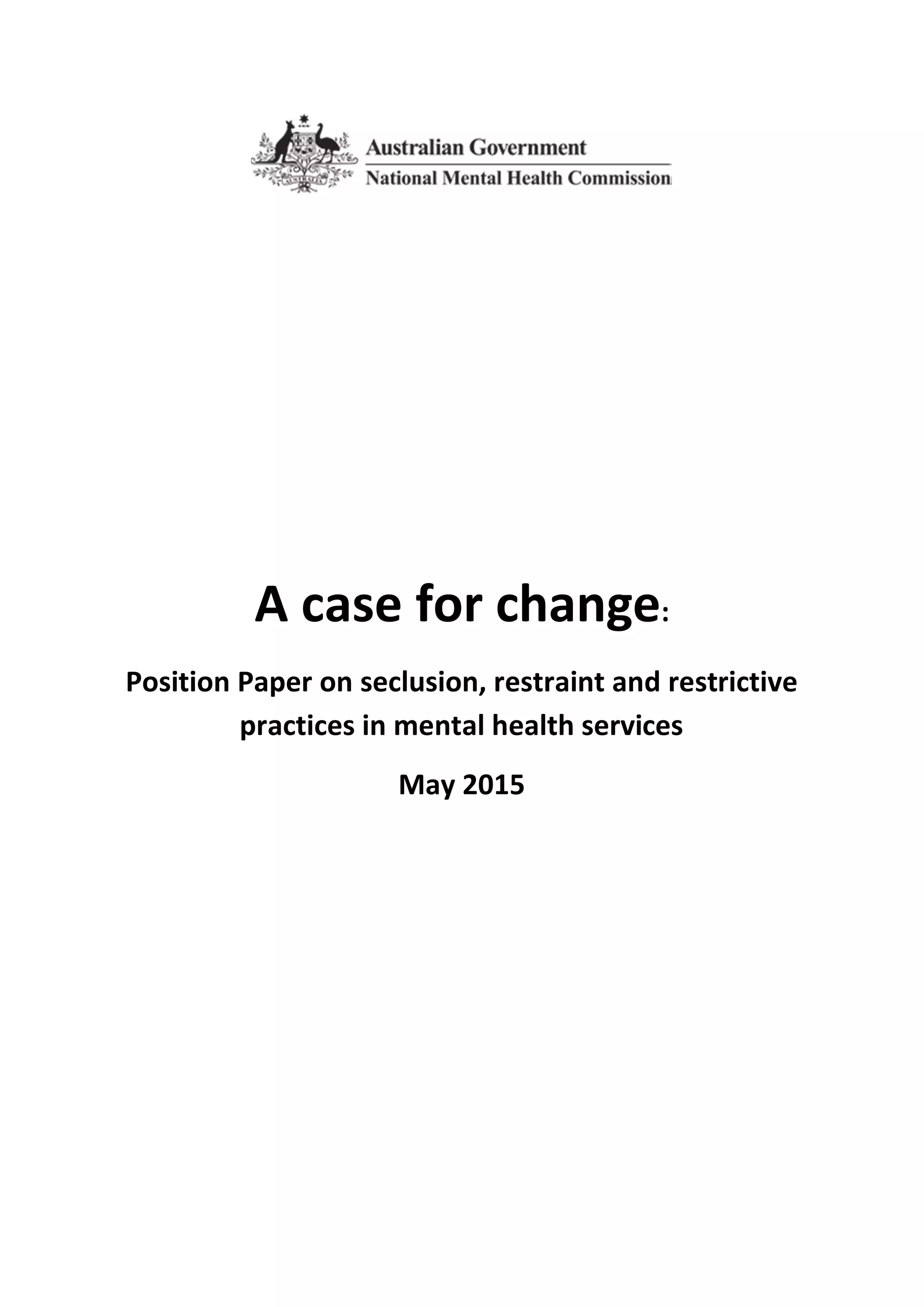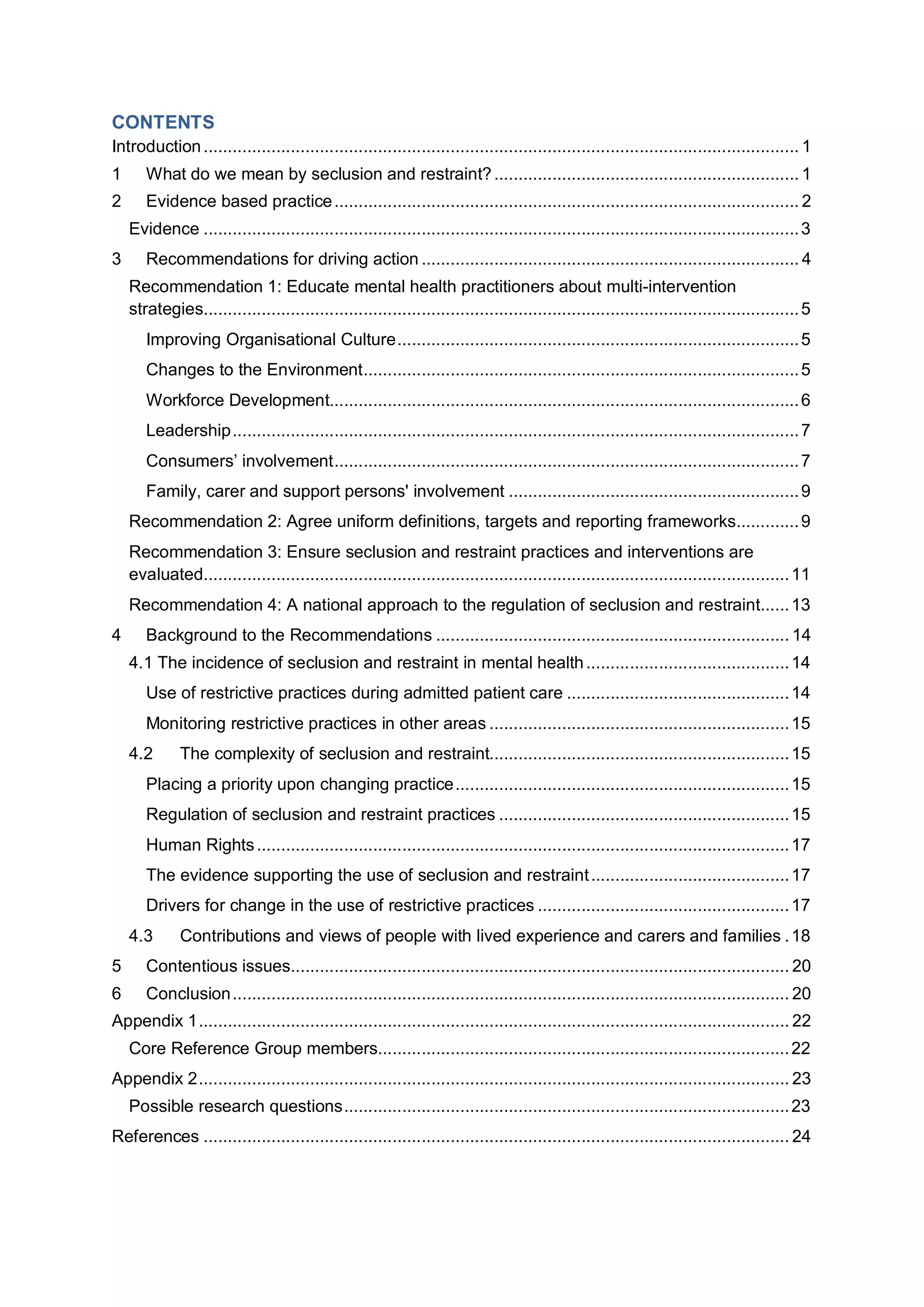 This document provides recommendations for reducing and eliminating the use of seclusion, restraint, and restrictive practices in mental health services. It begins with definitions of seclusion, restraint, and restrictive practices. It then outlines 4 recommendations: 1) educate practitioners about alternative strategies; 2) agree on uniform definitions, targets, and reporting; 3) evaluate seclusion and restraint interventions; and 4) take a national approach to regulating seclusion and restraint. Background information is also provided on the incidence of seclusion and restraint, the complexity of issues around their use, and contributions from those with lived experience.