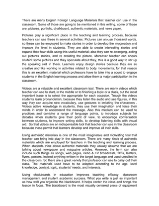 This document discusses the importance of materials in teaching English as a foreign language. It outlines several materials that teachers can use, including pictures, videos, authentic materials, chalkboards, dictionaries, and social networks. Teachers must carefully select materials that are appropriate for their students' ages, levels, knowledge, and contexts. A variety of materials should be used to avoid boring students. Social networks and technology can be useful resources when incorporated appropriately.