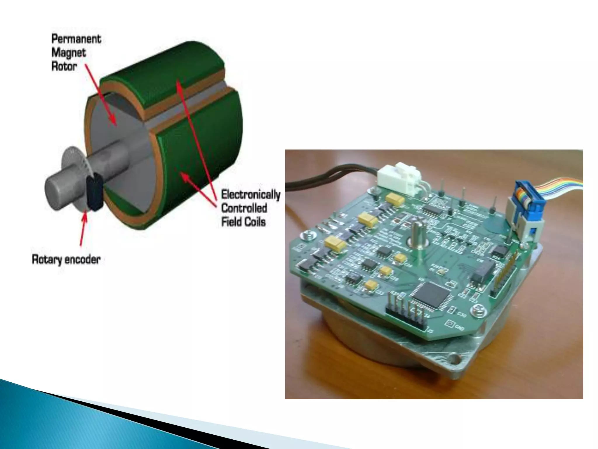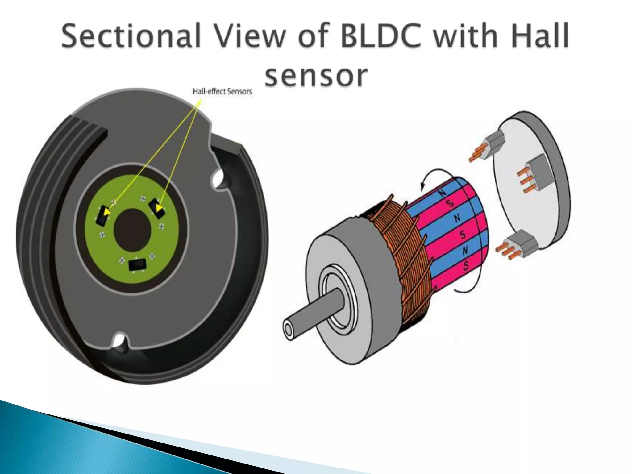 The document discusses different types of position sensors used in brushless DC motors. It describes how Hall effect sensors detect the rotor position by sensing changes in the magnetic field as poles pass by. Optical sensors use a light source and phototransistors to generate pulses as a shutter coupled to the rotor revolves. Sensorless methods can also determine position by sensing zero crossings of unenergized winding currents.