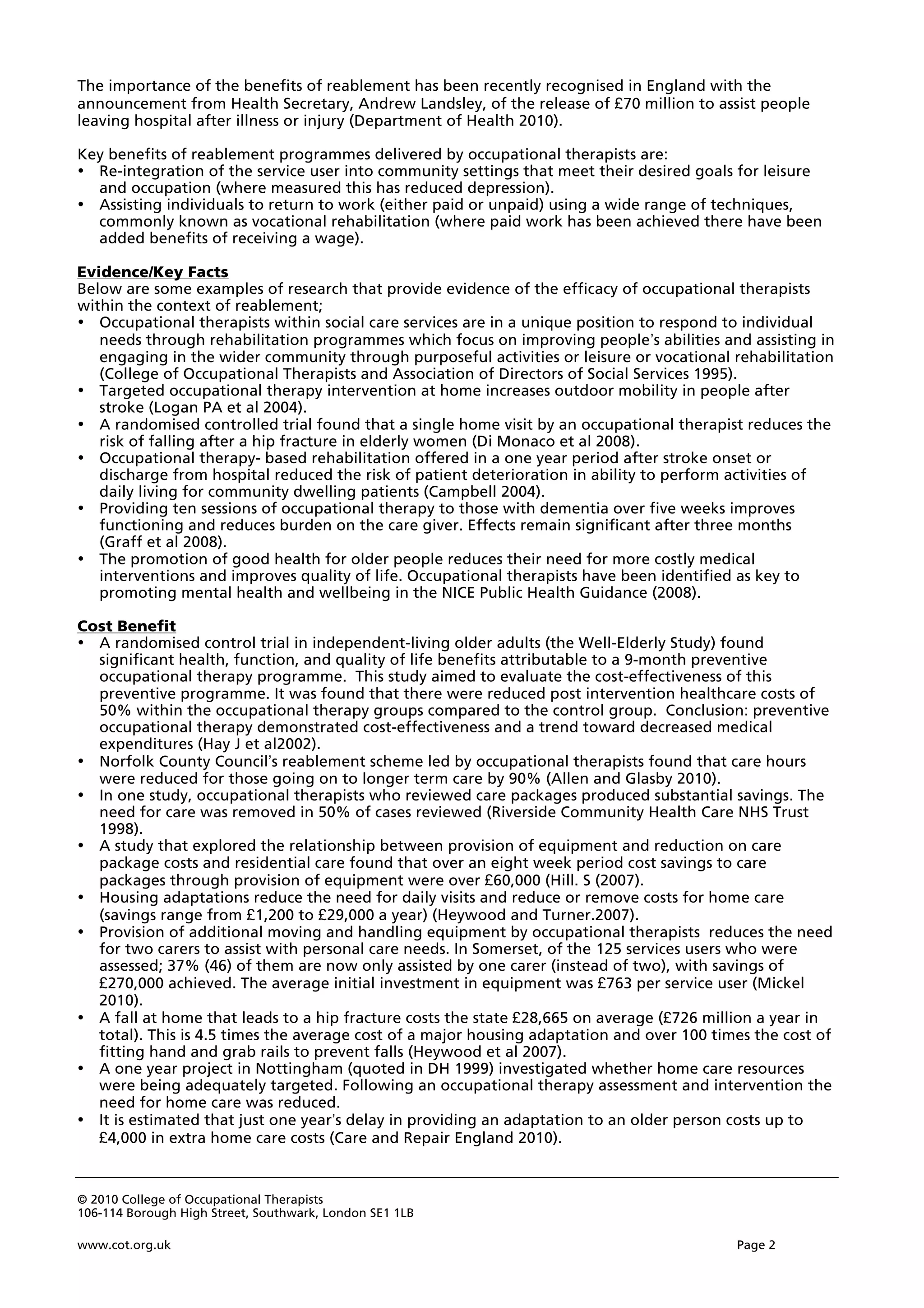 Occupational therapists can provide significant benefits and cost savings within reablement programs. Their training allows them to personalize reablement services based on an individual's medical, physical, and psychological needs. Multiple studies show that occupational therapist involvement leads to reduced home care needs, improved outcomes for patients, and healthcare cost reductions of up to 50%. If local authorities want to achieve the best results and cost benefits from reablement, they need to involve occupational therapists and their specialized skills.