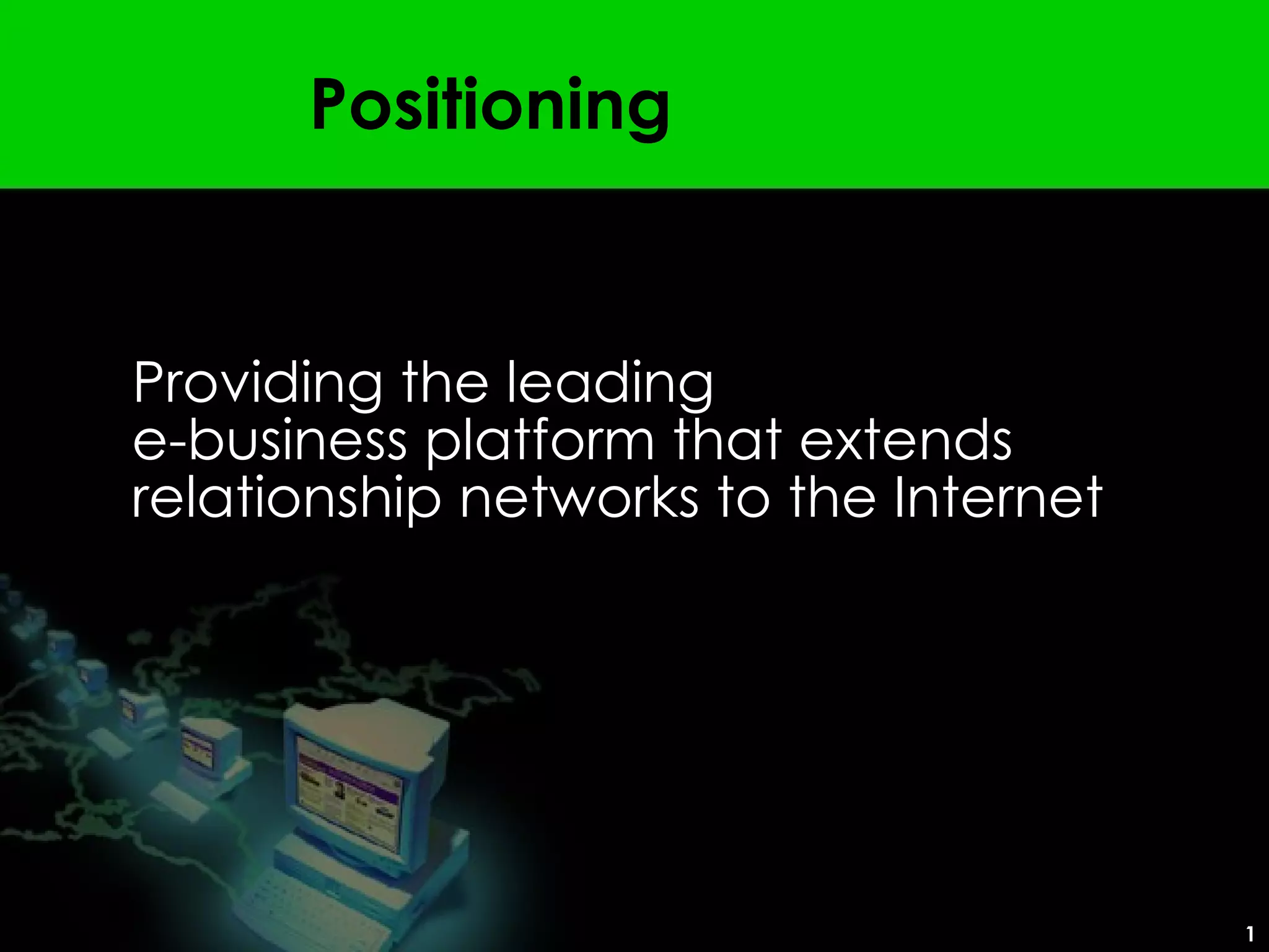 The document outlines a vision for an e-business platform that enhances relationship networks online, emphasizing the integration of business processes, technology, and personal connections. It presents relationship networks as essential for connecting various stakeholders, facilitating communication, and creating value chains in a digital landscape. Additionally, it highlights the need for organizations to extend these networks to the internet while maintaining control over their brand and content.