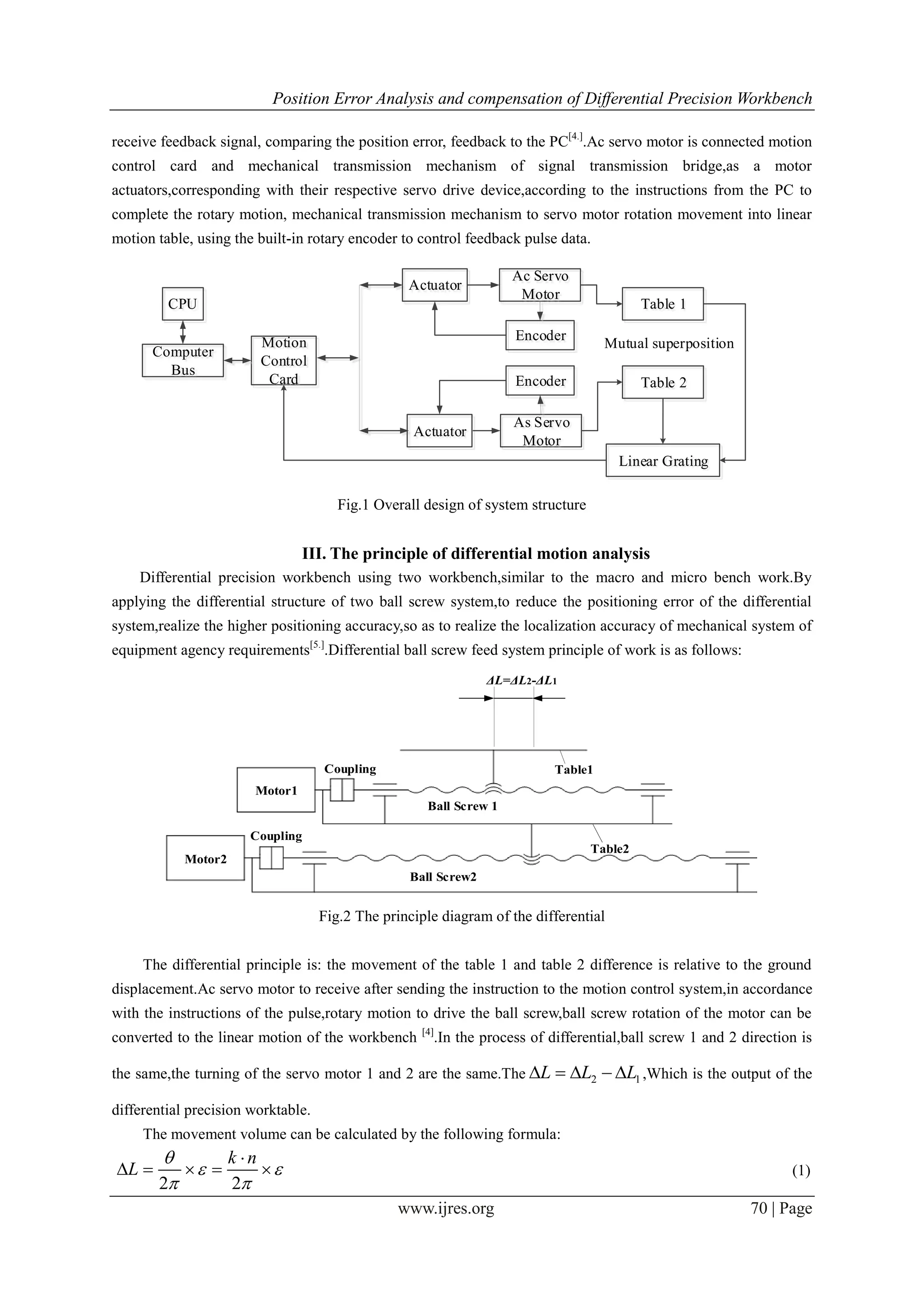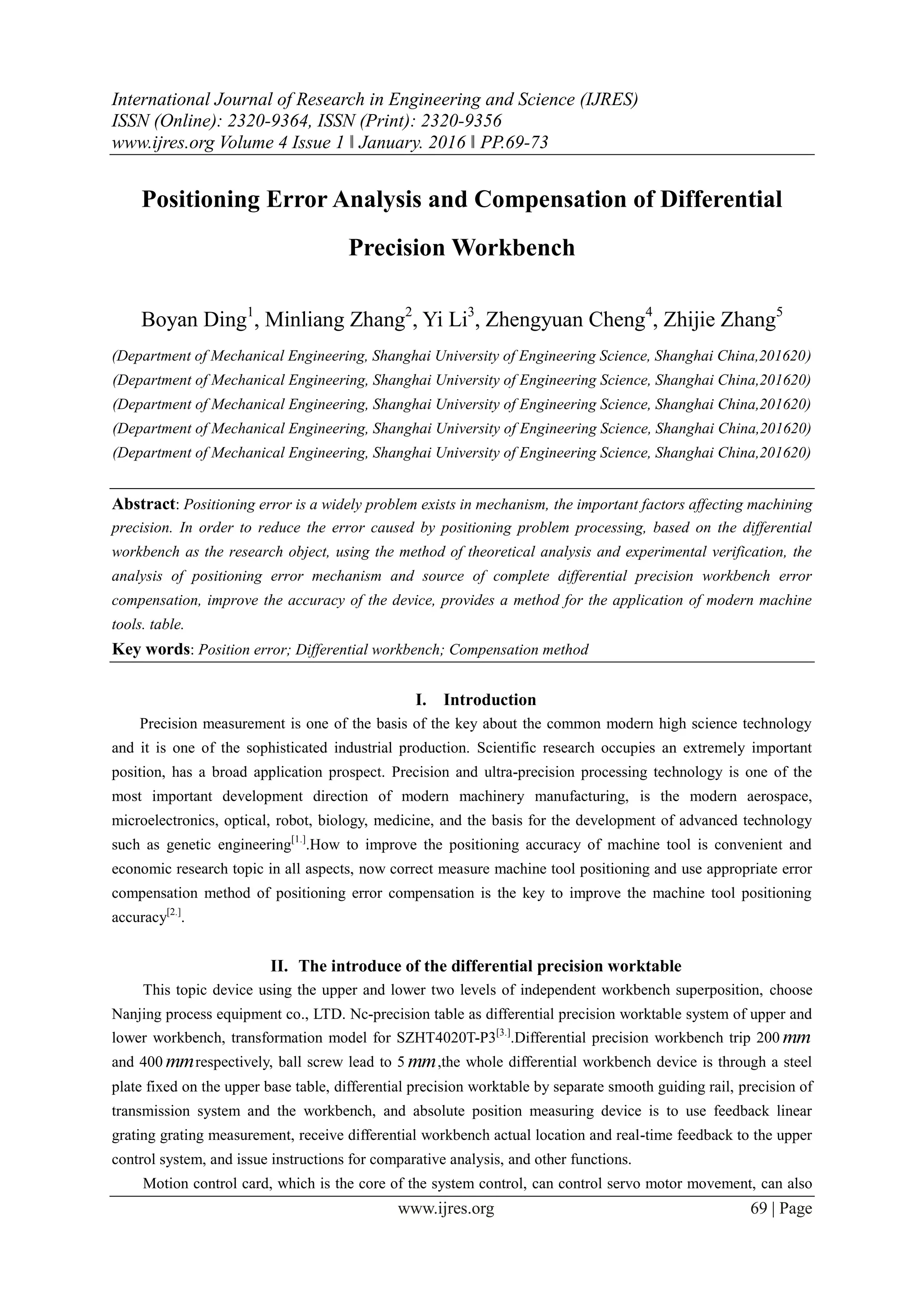 The document analyzes positioning errors in differential precision workbenches and proposes a compensation method. It discusses sources of error in workbench transmission systems and guides. Through theoretical analysis and experimentation, it is shown that positioning errors increase with travel distance due to factors like guideway errors. A method is developed to sample positioning at multiple points, compare values to identify errors, and implement reverse error correction through motion control cards. This allows positioning accuracy better than 15 micrometers over 150mm of travel to be achieved. The compensation method can improve precision for a range of machine tool designs.