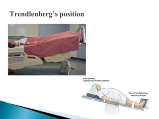 Positioning involves placing a patient in specific body alignments to promote health and allow for medical interventions. Some key reasons for positioning include providing comfort, relieving pressure on body parts, improving circulation, preventing deformities, and enabling examinations and treatments. Common positions include supine, prone, lateral, lithotomy and Fowler's positions, each having distinct uses and safety considerations. Positioning requires ensuring patient comfort and safety by using supportive devices and changing positions regularly.