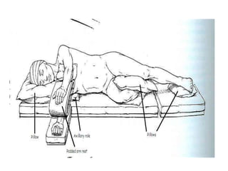 2. Various positions like supine, lateral, lithotomy and prone were discussed along with their physiologic effects and pressure points.