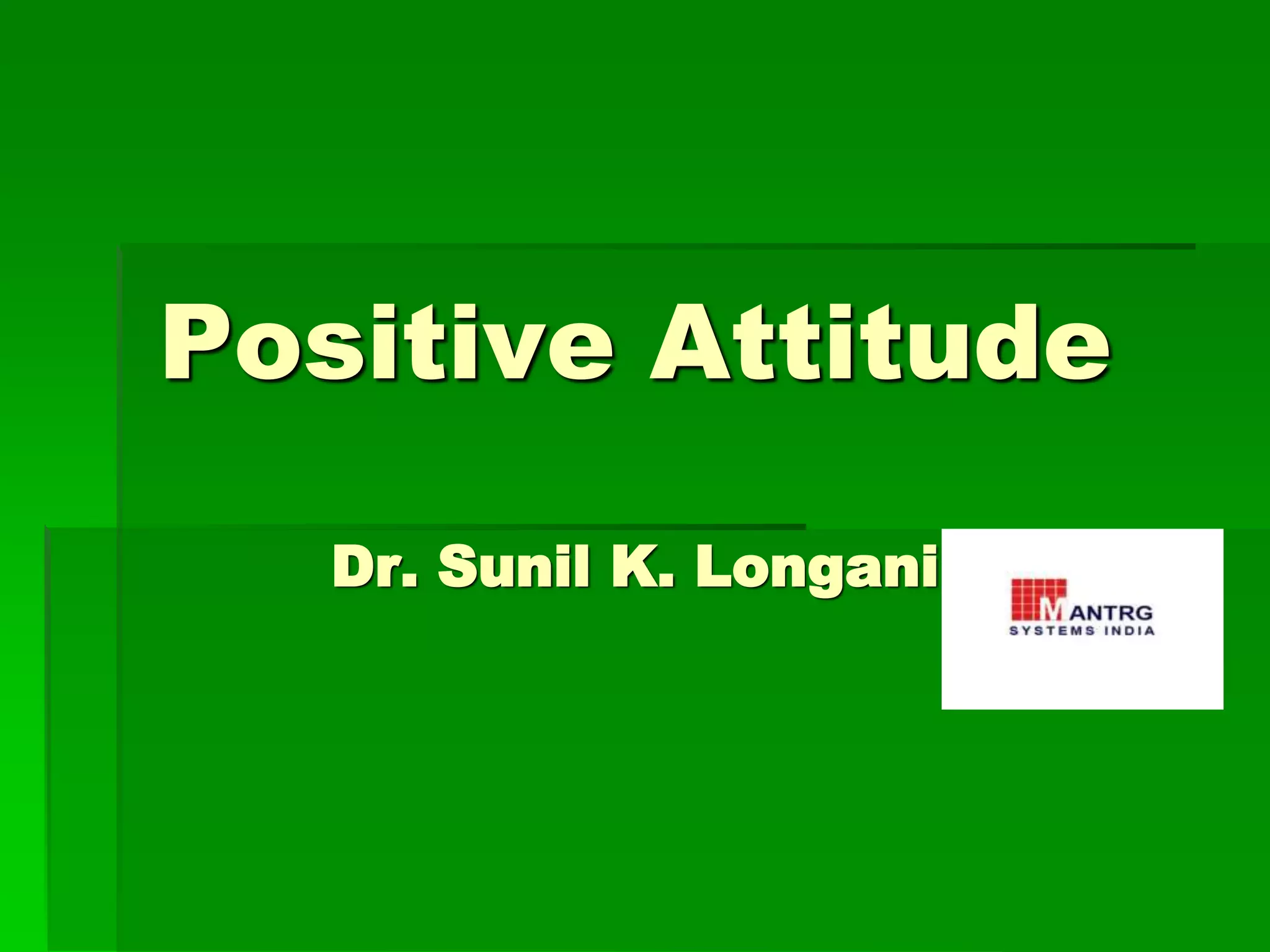 Dr. Sunil K. Longani emphasizes the importance of a positive attitude, asserting that attitudes significantly influence our experiences and achievements in life. The document discusses the concept of thoughts as fundamental elements that shape our past, present, and future, highlighting the power of positive thinking and affirmations. It includes various quotations and anecdotes illustrating how our mindset can transform our reality and success.