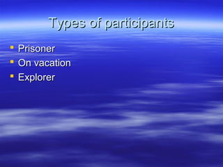 This document discusses the importance of developing a positive attitude and life skills. It provides examples of different types of participants in training programs, such as prisoners and explorers. Effective training programs require an open mindset and focus on interaction, learning, and personal growth. Developing a positive attitude means reflecting optimism outwardly through your behaviors and inwardly through your thoughts, beliefs and motivations. Maintaining a positive attitude can help you overcome challenges and achieve your goals. The document provides tips on cultivating a positive attitude, such as spending time with positive people, exercising, and ignoring negative thoughts.