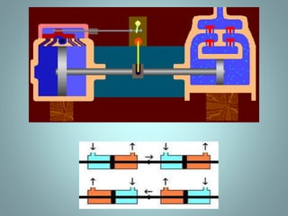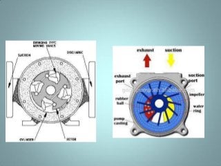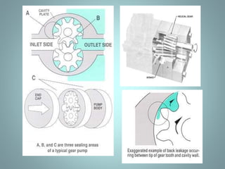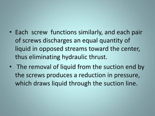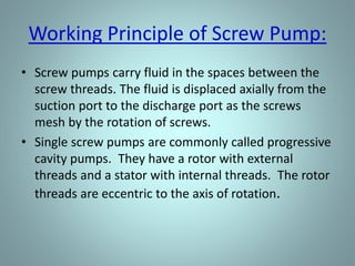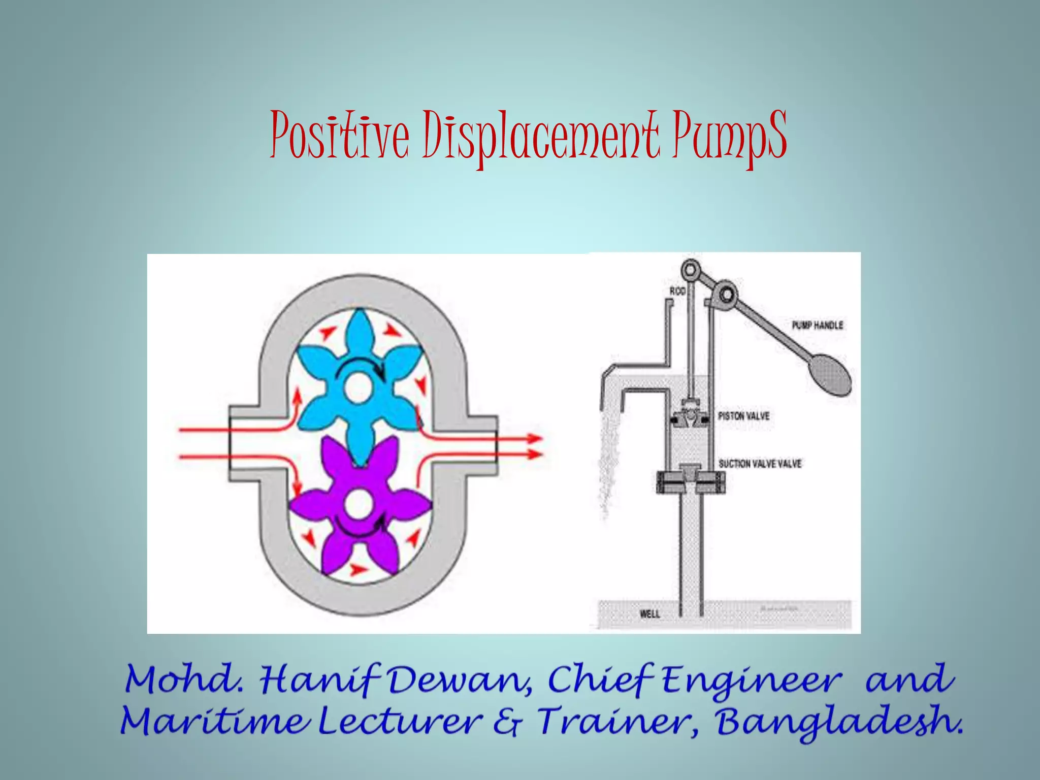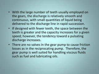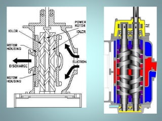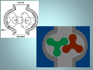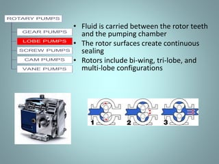 Positive displacement pumps move fluids by trapping a fixed volume and forcing that volume from the suction to discharge side. Reciprocating pumps, like piston pumps, use reciprocating motion powered by engines while rotary pumps use rotating components like gears or lobes. Piston pumps have two check valves and a reciprocating piston powered by translating rotary motion into linear motion. They can be direct or indirect acting, simplex or duplex, and single or double acting. Diaphragm pumps use a flexible diaphragm instead of pistons. Rotary pumps have gears, lobes, screws, cams, or vanes that rotate to trap and move fluid and include gear, lobe, screw, vane, and cam pumps
