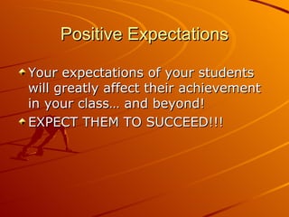 The document discusses the importance of having positive expectations for students and how expectations can influence student achievement and outcomes. It notes that positive expectations, where the teacher believes every student can learn and achieve, tend to become self-fulfilling prophecies where what is expected is what occurs. In contrast, negative expectations that some students cannot learn or that teaching will be unsuccessful often lead to poor student outcomes that confirm the low expectations. The key message is that a teacher's attitude and expectations, whether positive or negative, can significantly impact students.