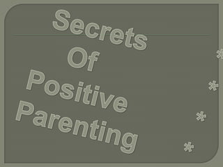 Raising a child in today's world is challenging for parents. The document provides guidance on positive parenting techniques to help children grow up healthy. It emphasizes becoming an expert in child development, providing unconditional love while also setting clear boundaries and rules, and empowering children by listening to their views and guiding them through tough decisions. The tips encourage focusing on developing a strong relationship with open communication, understanding a child's friends and influences, and seeking help from professionals when needed to best support a child's healthy development.