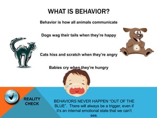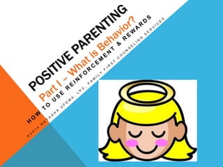 This document discusses the concept of behavior and how it is learned and reinforced. It explains that all behaviors serve a purpose and are reinforced through rewards or attention. Parents can increase positive behaviors in their children by specifically praising and rewarding wanted behaviors quickly after they occur. Unwanted behaviors are inadvertently reinforced when parents give attention or rewards too closely after the misbehavior. The document advises parents to "catch kids being good" and consistently reward those good behaviors in order to shape conduct over time.