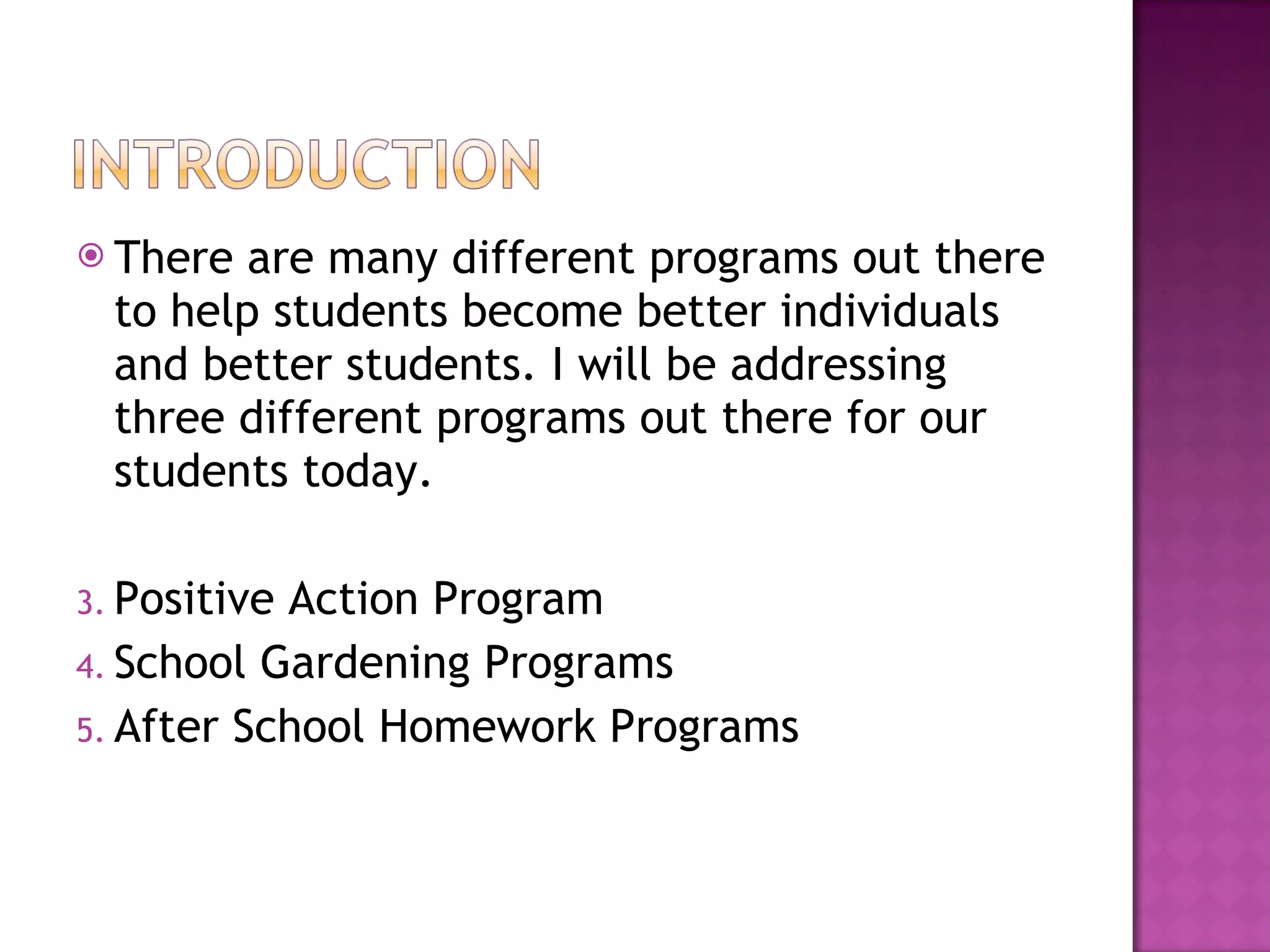 1) The Positive Action Program aims to reduce substance abuse and increase test scores. It focuses on self-management and runs from 1st to 12th grade.