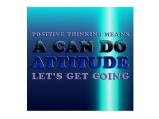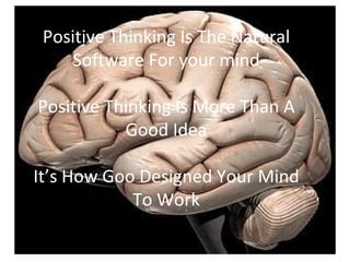 The document discusses the importance and benefits of positive thinking. It states that positive thinking is the natural way our minds are designed to work. It encourages the reader to visualize their goals, be grateful for what they have, and release their desires to the universe. The document then outlines five steps to develop positive thinking: 1) Observe negative thoughts, 2) Understand how thoughts shape experiences, 3) Decide who you want to become, 4) Create daily affirmations and visualizations, and 5) Repeatedly practice positive thinking every day.