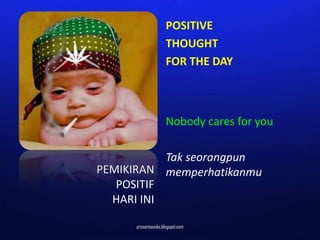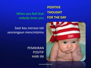 The document discusses having positive thoughts when feeling unloved or ignored by others. It suggests asking yourself if the reason others are ignoring you is because you are too attractive, rather than a lack of care or interest from others. The overall message is to consider alternative perspectives rather than assume others' negative perceptions.