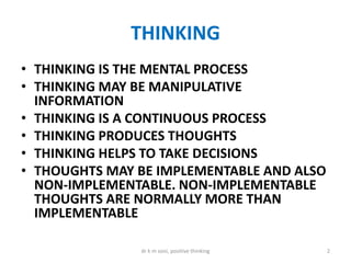 The document discusses different types of thinking and thoughts. It describes thinking as a continuous mental process that can be manipulative and helps with taking decisions. Thoughts emerge from continuous thinking and can be influenced by internal and external environments. Thinking can be positive or negative, controlled or uncontrolled. Negative thoughts in particular can grow stronger over time if not addressed, leading to issues like stress and poor health. The document provides a detailed overview of various thinking processes.