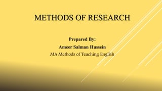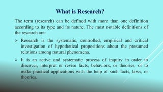 This document discusses research methods and positivism. It defines research and outlines key aspects of the scientific method including its purposes and steps. Positivism relies on empiricism and determinism and views science as the only valid approach. However, positivism and the scientific method have also received criticism for being reductionist and dehumanizing by failing to account for things like individuality and choice. Critics argue they present a restricted and conservative view of human behavior.