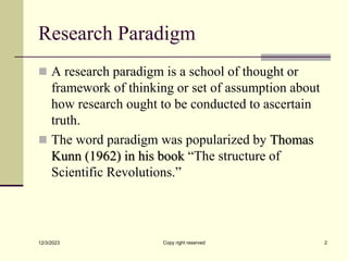 The document discusses the research paradigms of positivism and interpretivism. Positivism relies on quantitative methods and objective facts, viewing society as external forces that dictate human behavior. Interpretivism relies on qualitative methods and subjective meanings, viewing humans as shaping behavior through perceptions. A mixed-methods approach combines these paradigms to avoid their individual limitations.