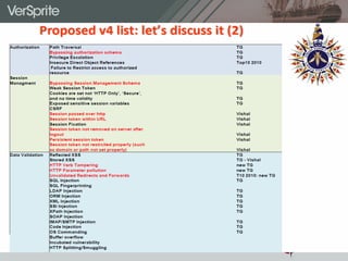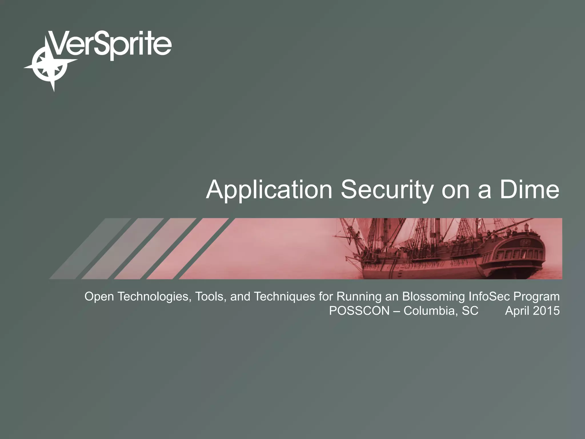 This document discusses application security testing techniques and tools that can be used on a limited budget. It recommends establishing security governance through policies, standards and guidelines to provide structure for a security program. It introduces the Open Web Application Security Project (OWASP) as an open source community and lists some of their key resources like the Open Software Assurance Maturity Model (OpenSAMM) for evaluating security practices, and tools like AntiSamy and CSRFGuard for protecting against common vulnerabilities. The document advocates threat modeling to identify risks and provides examples of tools for static analysis and dynamic testing of applications to identify security issues before attackers.