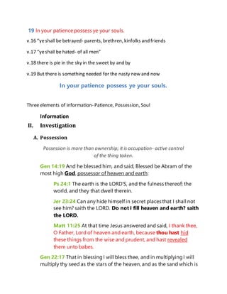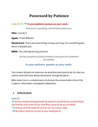 The document discusses the importance of patience and possessing one's soul through patience as stated in Luke 21:19. It provides information on the meaning of possession, patience, and soul from biblical passages. Possession refers to active control, patience involves enduring difficulties humbly as God works, and the soul is one's personality and actions. The conclusion exhorts applying patience to possess one's soul by obeying God and not trying to control circumstances. Remaining patient allows God to work and saves one from being possessed by sin or the world.