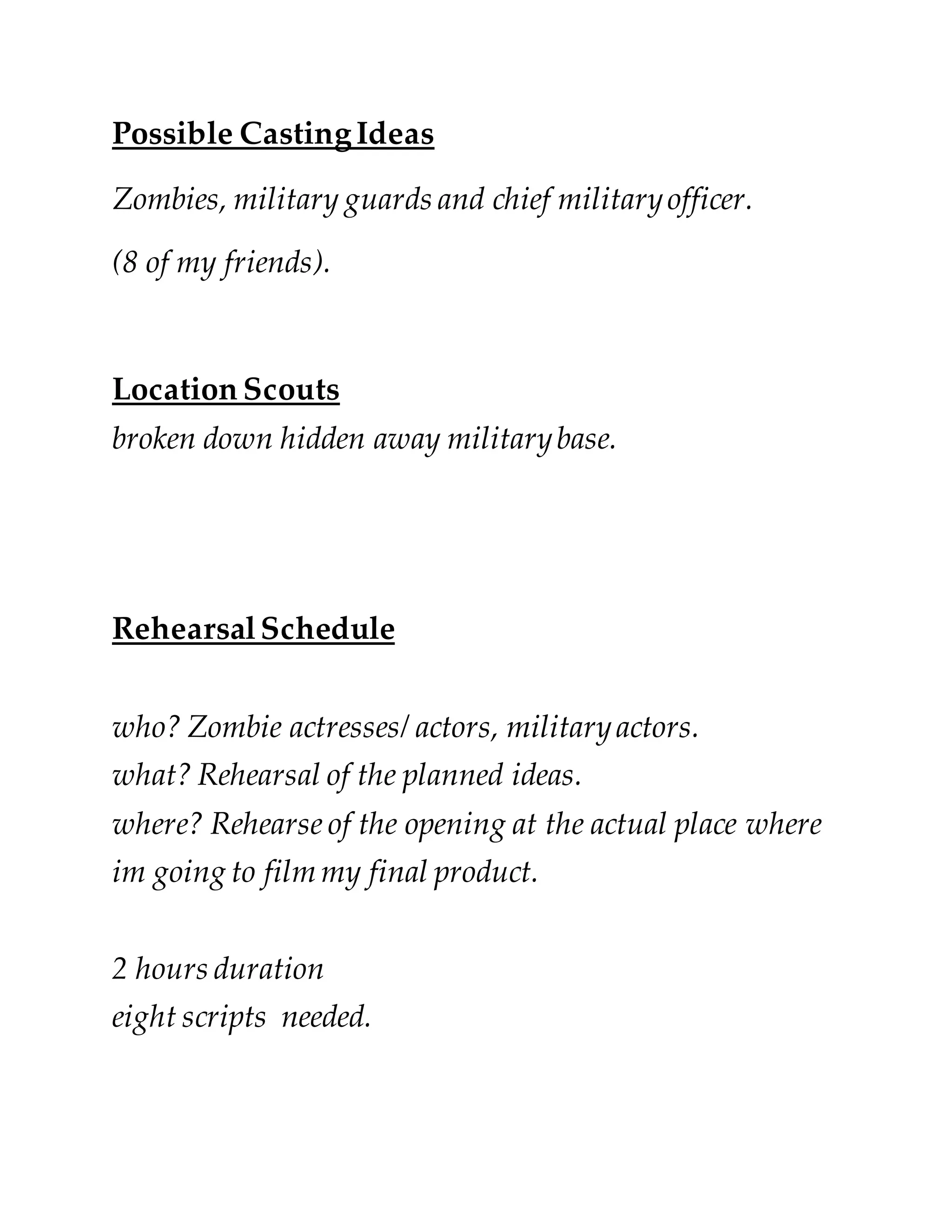 This document discusses casting ideas, location scouts, and a rehearsal schedule for a film project involving zombies, military guards, and their chief officer at a broken down hidden away military base. It notes the need for 8 zombie and military actors to rehearse the planned ideas and opening scene for 2 hours at the actual filming location, and requires 8 scripts.