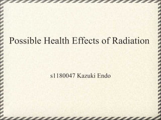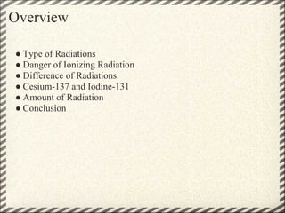 This document discusses the different types of radiation and their health effects. It outlines ionizing radiation, which can break down body structures and cause nausea, fatigue, hair loss, and death at high levels. Two types of radiation from Fukushima are cesium-137, which can cause sarcoma and contaminate foods/water, and iodine-131, which can cause thyroid tumors but can be prevented with iodine tablets. The document concludes by noting the need to monitor radiation levels until Fukushima is stopped and consider new energy resources to replace nuclear power.